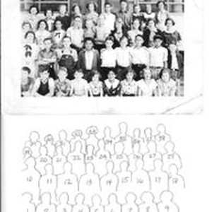Photo--black and white: Oak Grove Grammar School class prior to Dec. 1934 in Graton, California standing in front of screening in porch of school. Identified students include: 1. Kanemi Ono,2. Robert Carillo (Carrillo), 5. June Rogers, 7. Jewell Rogers, 9. Audrey Havenstrite, 11.Carl Baker,12 Leland Beckman, 13. Tad (Tadashi) Ono, 15. Wendell Havenstrite, 17. John (Yonemi) Ono, 21. Frances Lombard, 23. Burnham Graham, 24. Harold Narron,27. Betty Hallberg, 30. Audrey Ross, 32. Betty Kenezer, 34. Lombard,37. Blackwell, 38. Bertoli. See diagram.