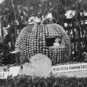 Photo--Black and white: Gravenstein Apple Fair display featuring a pumpkin made of apples.