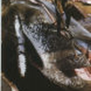 A man strips the blubber off a whale aboard the "Kosmos V" ship, a Norwegian factory ship from 1966-1967.