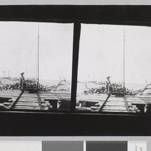 A man stands on a dock next to a large cart of vegetables, with more vegetables sitting on the dock around him. Behind him is a sailing ship. Title and date transcribed from envelope. Copy print of original. Ship in photo is likely the Snark.