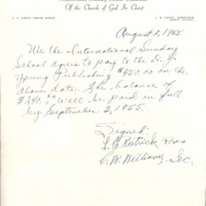 C. W. Williams, letter, 1955 Aug. 2, to D.J. Young Publishing Company regarding agreement to pay. [Description English/roman)]