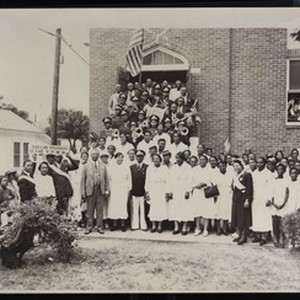 Photograph of a large group of people -- the Young People's Willing Workers (YPWW), Church of God in Christ (International Youth Department), Dallas, Texas, Division, [s.d.]. [Description English/roman)]