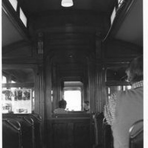 Photo--black and white: Interior of a P&SR passenger car. Probably a refurbished car.