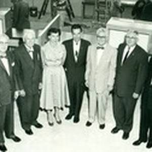 Mr. Whitsett and six unidentified people at lobby of unidentified Valley Federal Savings and Loan.