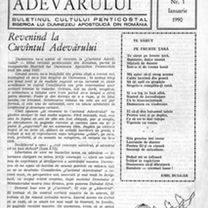 Cuvantul Adevarului este publicația periodica oficiala a Bisericii Penticostale din Romania incepand din anul 1990 pana in prezent. [Description (original non-English/roman language/script)] The Word of Truth is the periodical, official publication of the Romanian Pentecostal Church beginning from 1990 to present. [Description English/roman)]