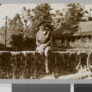 Charmian London sits on stone fence wearing riding boots on Jack London Ranch.