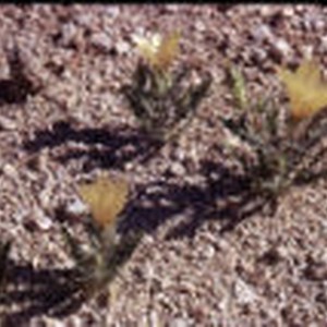 Close-up of four small plants, three with yellow flowers, on desert ground.