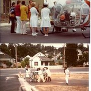 Photo--Color: Four photographs of Palm Drive practice emergency evacuation drill with the Sonoma County Sheriff's helicopter, 1976.