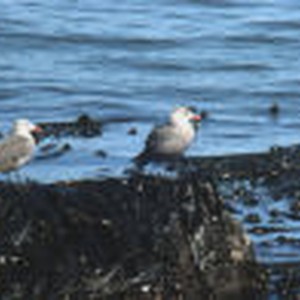 Two Heerman's gulfs standing by a rofhhh o the shore.