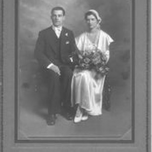 Photo--black and white, in studio folder: Formal wedding portrait of unknown young couple, about 1920s. Boussum Studio, San Francisco, Sacramento, Oakland.