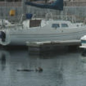 A female sea otter feeding on crab while relaxing at a harbor.
