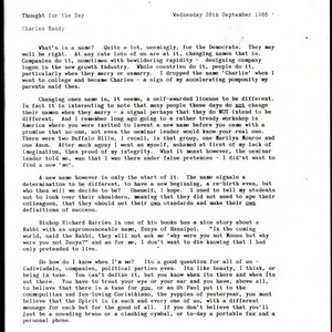 Thought for the day by Charles Handy on being in tune with one's self, and being an individual, to carve out one's own sense of success and standards, September 28, 1988; Charles Handy Papers; Box 18, Folder 4; 1 page
