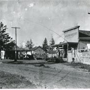 Photo--black and white: Molino Grocery store--owner R. D. Hathaway. F. Berton & Co. Liquor Store Sebastopol. Blacksmith shop in middle background. Electrical power lines overhead. Road in front of store probably (today's) Gravenstein Highway and cross street Occidental Road. Circa 1904.