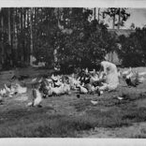 Photo, black and white: Hallberg Ranch chicken and unidentified woman.