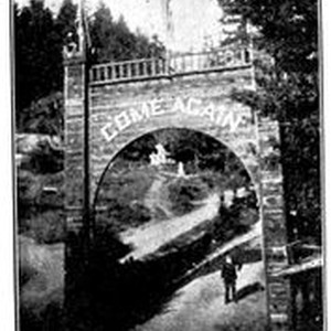 The wooden "Come Again" arch at Camp Meeker California near the Russian River, 1907.
