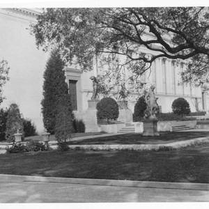 A view of the south side of the library building, with statues and rounded topiaries flanking the steps leading to the east and west entrances to the buildings.