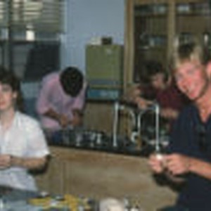 Kathy Birah, Dave Second, Kari Sears, and Jonathon Scheffer use lab equipment for plant transpiration in Biology 62.