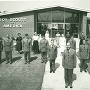 Exterior of W. P. Whitsett Hall, headquarters for the Boy Scouts in the San Fernando Valley, located at 14955 Saticoy Street; seventeen unidentified people standing in front of entrance.