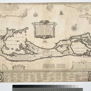 A mapp of the Sommer Ilands once called the Bermudas : lying at the mouth of the bay of Mexico in the Lattitude of 32 degr. 25 mi. ; distant from England viz from London toward the west south-west 3300 miles and from Roanoack in Virginia towards the east south east 500 miles ; exactlie surveyed.