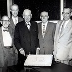 William P. Whitsett and four men are standing around a cake on which is written "32" for unknown event.