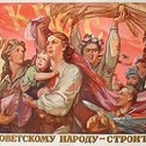 Soviet political poster. Caption reads, "Слава великому Cоветскому народу -- строителю коммунизма! / Slava velikomu Sovetskomu narodu -- stroiteliu kommunizma!", meaning, "Glory to the great Soviet people, the builders of Communism!". [Description English/roman)]
