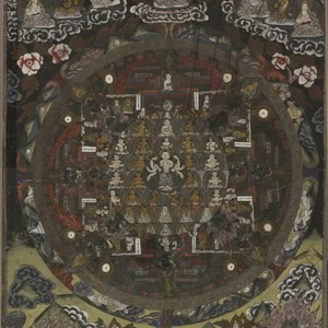 A diagrammatic representation of deities and demons on earth and in the sky around a mandala.