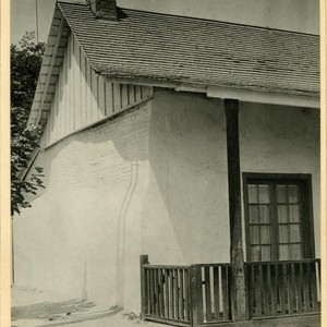 Adobe, Monterey, California: corner view, adobe side elevation and gated porch [Casa Abrego, 592 Abrego St.].