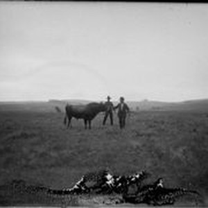 Negative glass-plate photo: From a glass plate negative made by William Borba. Two men with bull in a field. One man his holding a rope that is around the horns of the bull.