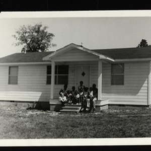 Photograph of the Travis family (mother, father Lindberg, 10 children?) on the porch of their new house, [s.d.]. [Description English/roman)]