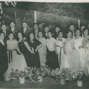 Group photo of nine couples at the Club de Madres de Santa Maria Center (C.Y.O., Catholic Youth Organization) Winter Dance, including Alberto Aviles (back row, 3rd from left) and Lupe Aviles (nee Rivera; front row, 4th from left).