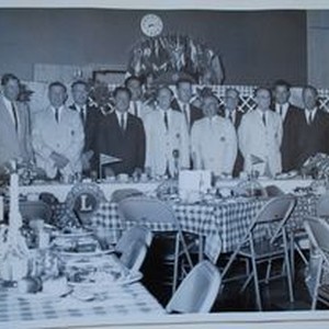 Photo--black and white: Sebastopol Lions Club scrapbook photo: Lions Club installation of members. L-R: Jack Robinson, Sam Leighty, Vern Hassett, Glenn Klineman, Ted Schoen, Jack Fore, Don Shatto, Al Rabinovitz, Ed Kinsey, Claude Roberts, Vern Avila and Spencer Bisby.