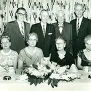 Luncheon for Valley Federal Savings Directors, 4 men standing and 4 ladies sitting, including Mr. and Mrs. Whitsett.
