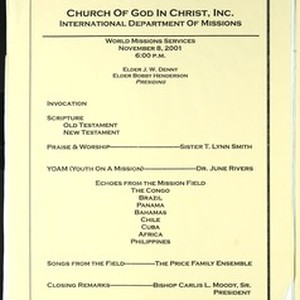 World missions services program, 94th Annual Holy Convocation of the Church of God in Christ, Memphis, Tennessee, 2001 November 8. Includes a handwritten note. [Description English/roman)]