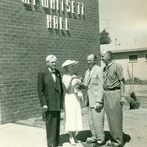 Mr. and Mrs. Whitsett and two unidentifed men standing in front of Whitsett Hall; Boy Scouts headquarters.