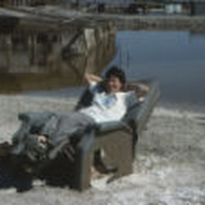 Student sits on broken recliner found on the water's edge.