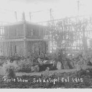Postcard--black and white: 1915 Gravenstein Apple Show exhibit of a house made of apples.