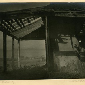 Adobe, Near Corona, California: dilapidated porch, overhang.