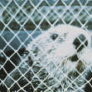 The face of a sea otter that is sitting in a pen.