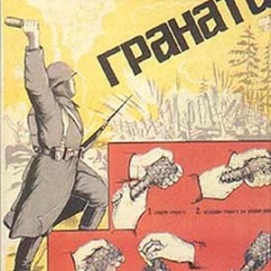 A poster. Caption reads, "Korotka s vragom rasplata, kol' v rukakh boitsa granata / Korotka s vragom rasplata, kol' v rukakh boitsa granata", meaning, "The conversation with an enemy gets very short if a soldier has a grenade". [Description English/roman)]