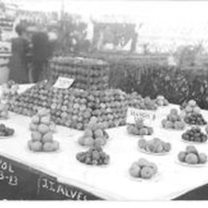 Postcard--black and white: A 1913 Gravenstein Apple Show exhibit of a table of apples displayed on plates. Photographed by J. J. Alves