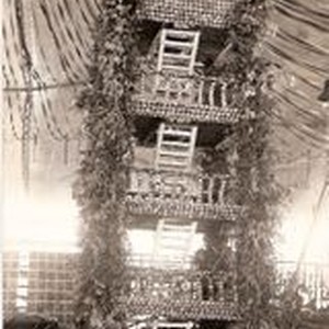 Postcard -black and white photo- 1915 Gravenstein Apple Show display of Camp Meeker Living Tower. The original Living Tower in Camp Meeker was made of four redwood trees with platforms and ladders. It was a recreational tower to bring people to the Camp Meeker area. (postcards were removed from album accession #05-007) fair condition