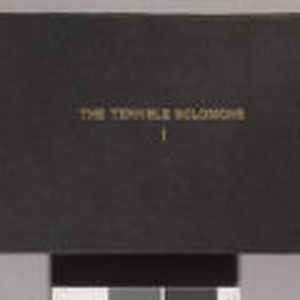 Album is bound in textured black material. The title, "The Terrible Solomons I," is embossed in the center of cover in gold lettering. The number '63" is affixed to the top of spine with glue. Images are of indigenous people and places as well as Western inhabitants of the Solomon Islands. Very light wear on surface and edges. Front edge of spine has moderate wear.