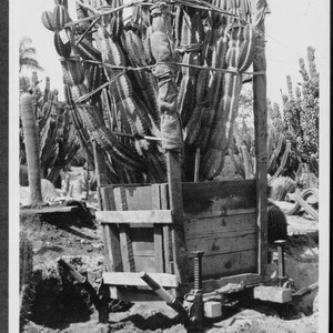 A boxed and bound cereus specimen about to be planted in the desert garden. The label that accompanies this photo in the album reads "Cereus gonianthus, N. B-97."