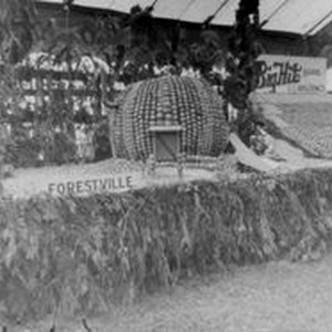 Photo--black and white, from Borba 8" x 10" celluloid negative: Gravenstein Apple Show display of an huge apple, made of apples for the Forestville exhibit. To the right is an apple exhibit by G. S. Mascagni of "Big Hit" brand apples. about 1930.