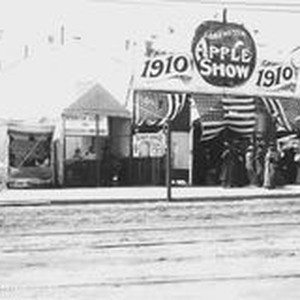 Photo--sepia: The first Gravenstein Apple Show in 1910 in Sebastopol. The Apple Show was held in a tent across from the Petaluma & Santa Rosa Railway Depot in August, 1910 and promoted local apples and fruit. The front entrance and ticket office with American flags hung from the front sign. An Information Bureau and Horticultural Commisioner tent is to the left of the front gate.