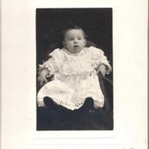 Photo--black and white, studio matted: Ethel M. Sharp at 14 months old, about 1908. Ethel is the younger sister of Clifford, Gertie and Lester Sharp and child of Mr. & Mrs. Earl Sharp. Shaw Studio, Santa Rosa, CA