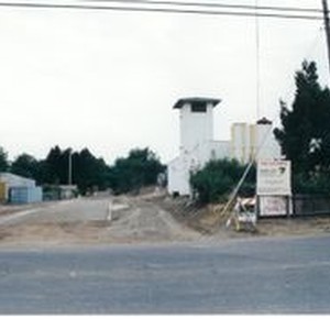 Photo--color: Graton Fire Deptment building on right at the corner of Graton Road and Ross Road in Graton. The large building on the left is currently (circa 2008) the Empire West Plastic company. The paved road in the foreground is Graton Road. The "road" between the buildings was previously the railroad tracks of the P&SR railroad that has since be turned into the Joe Rodota Trail that runs from Santa Rosa to Forestville. Sonoma County Regional Parks Trail Development sign visible near trail construction.