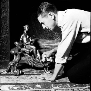 Attendant is kneeling on marble floor in front of the fireplace at the east end of the Huntington residence library. Label accompanying photograph in album reads "HEH 12 Attendant polishing andirons, fireplace in Library room of Huntington Art Gallery." Photograph appeared in Los Angeles Times article of November 6, 1938.