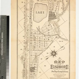 Town was first established in 1883, but was not incorporated until 1888; map must predate 1893, when Riverside County was founded, with Lake Elsinore in its limits. Old shelf number: eph J4-11(5). From the lake south through Wildomar. Prime meridian: GM. Relief: hachures. Graphic Scale: Chains, mile. Projection: Cylindrical. Printing Process: Lithography. Verso Text: MS note: Eph J4-11(5).