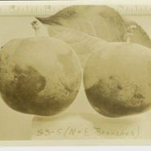 Photo, black and white: Plums (two plums with ruler at top). Caption: "SS-5 ( N & E branches)." Circa 1930